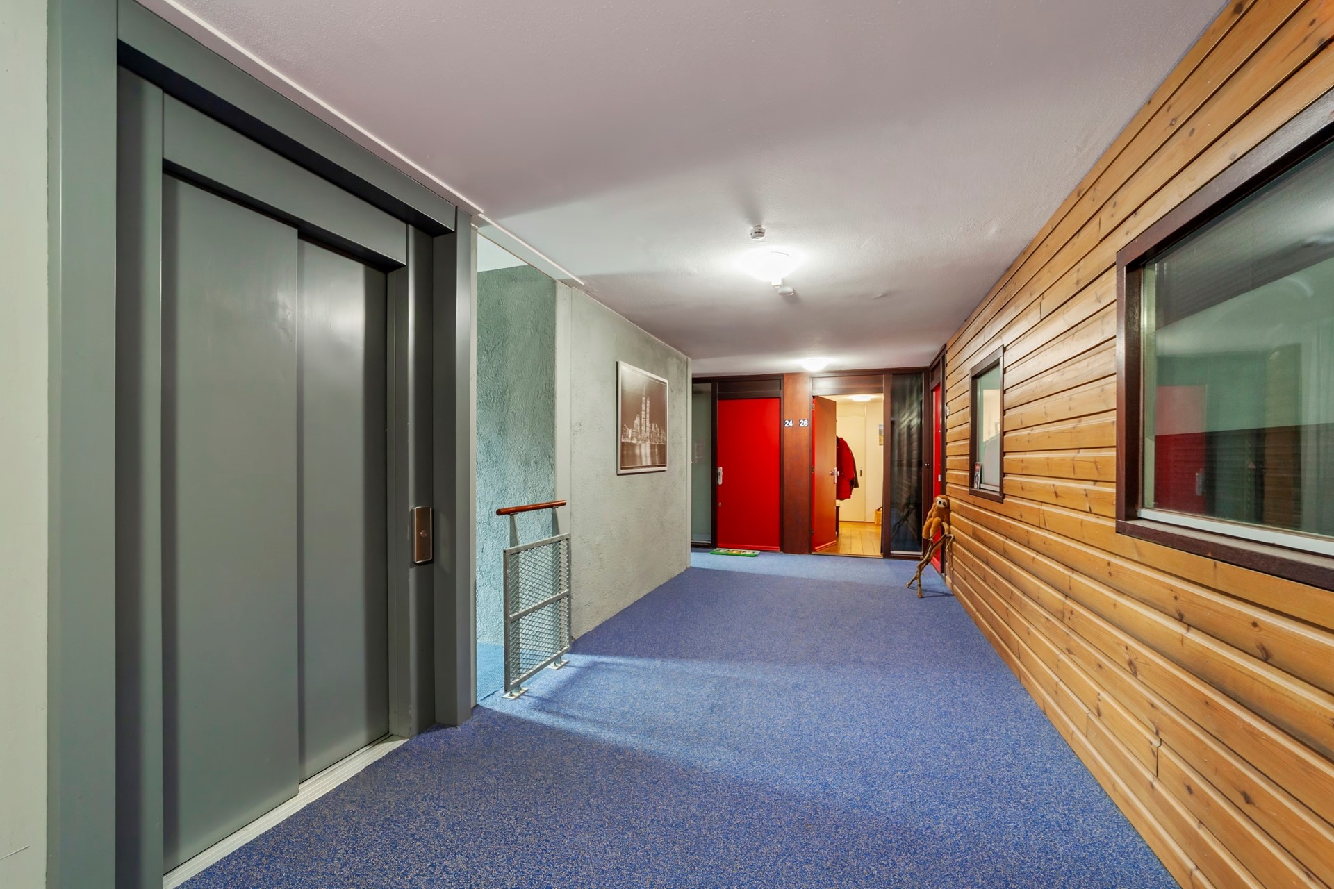 Centrale hal met lift en trappenhuis naar de tweede etage.