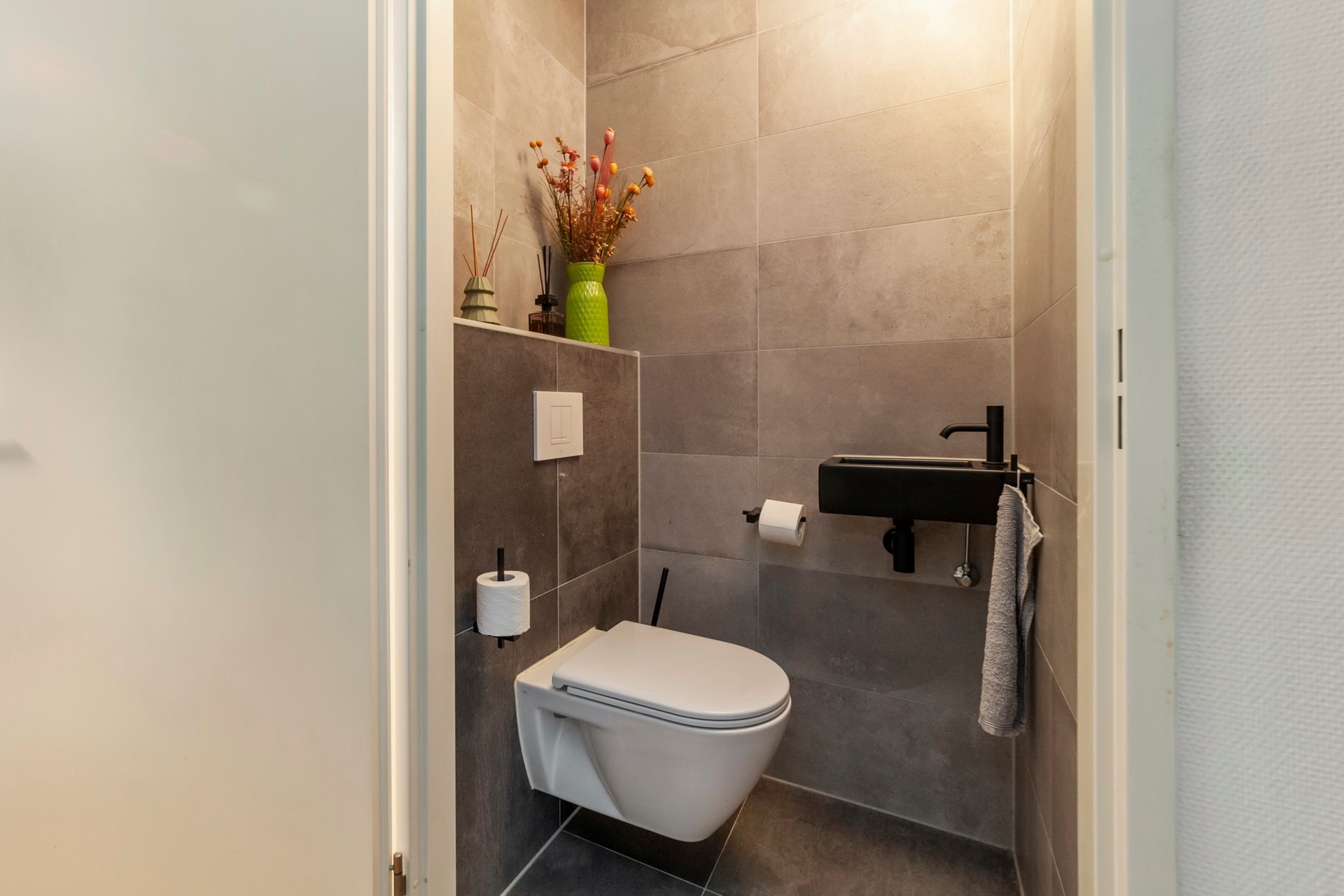 Hal met modern hangend toilet en fontein, meterkast, strakke glazen tegelwand en inpandige berging ( welke volledig is betegeld ) met opstelplaats C.V., wasmachine en droger aansluiting.