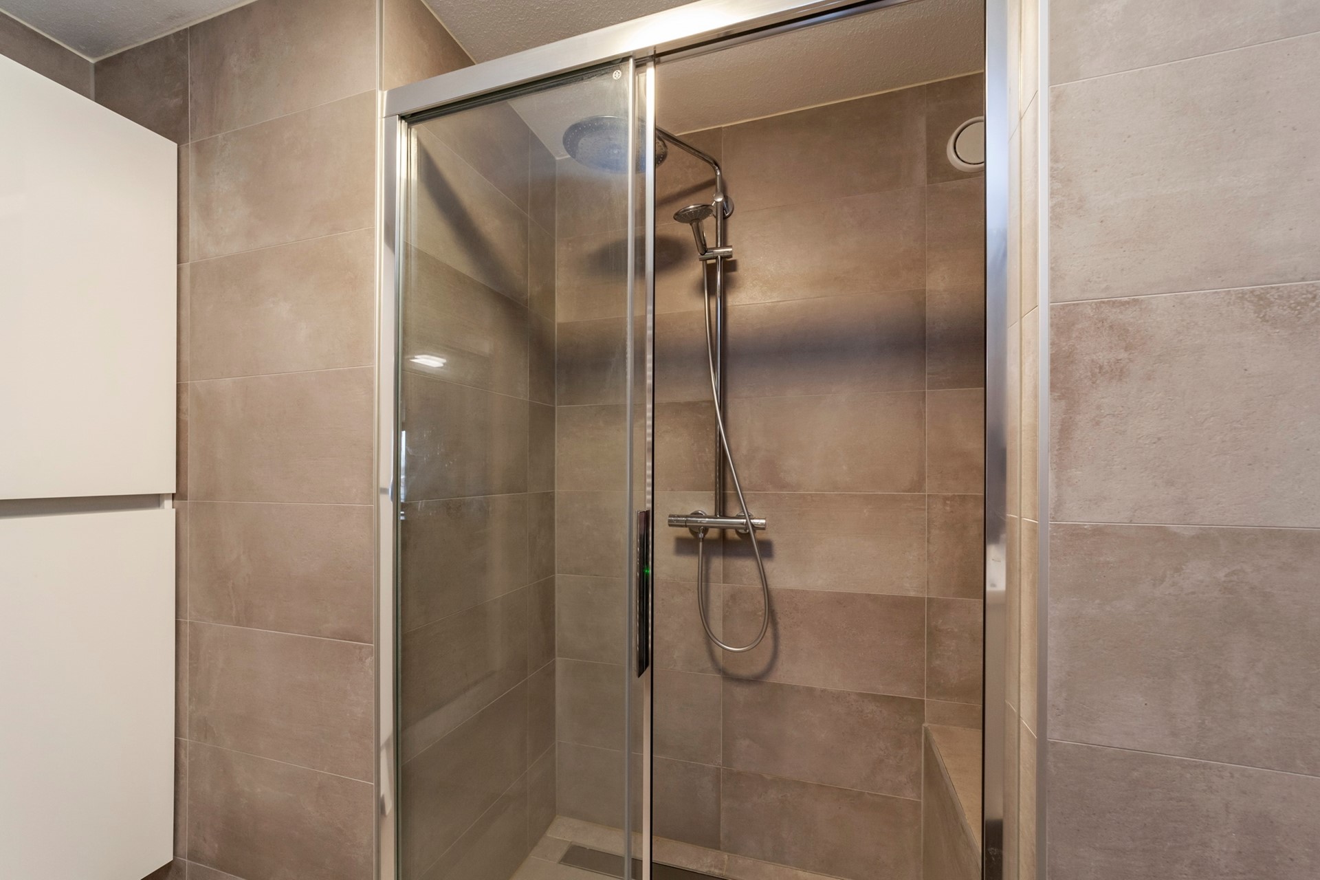 Luxe badkamer met inloopdouche met vast zitje en ingebouwd zeepbakje, wastafelmeubel en spiegelkast.