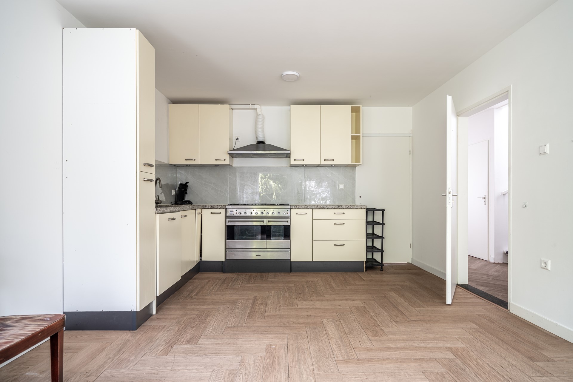 Front garden with entrance. Spacious hallway with wardrobe, toilet with washbasin, and two built-in cupboards. Open kitchen at the front in a straight layout. Cozy and bright living and dining room at the rear with direct access to the sheltered backyard and side garden.