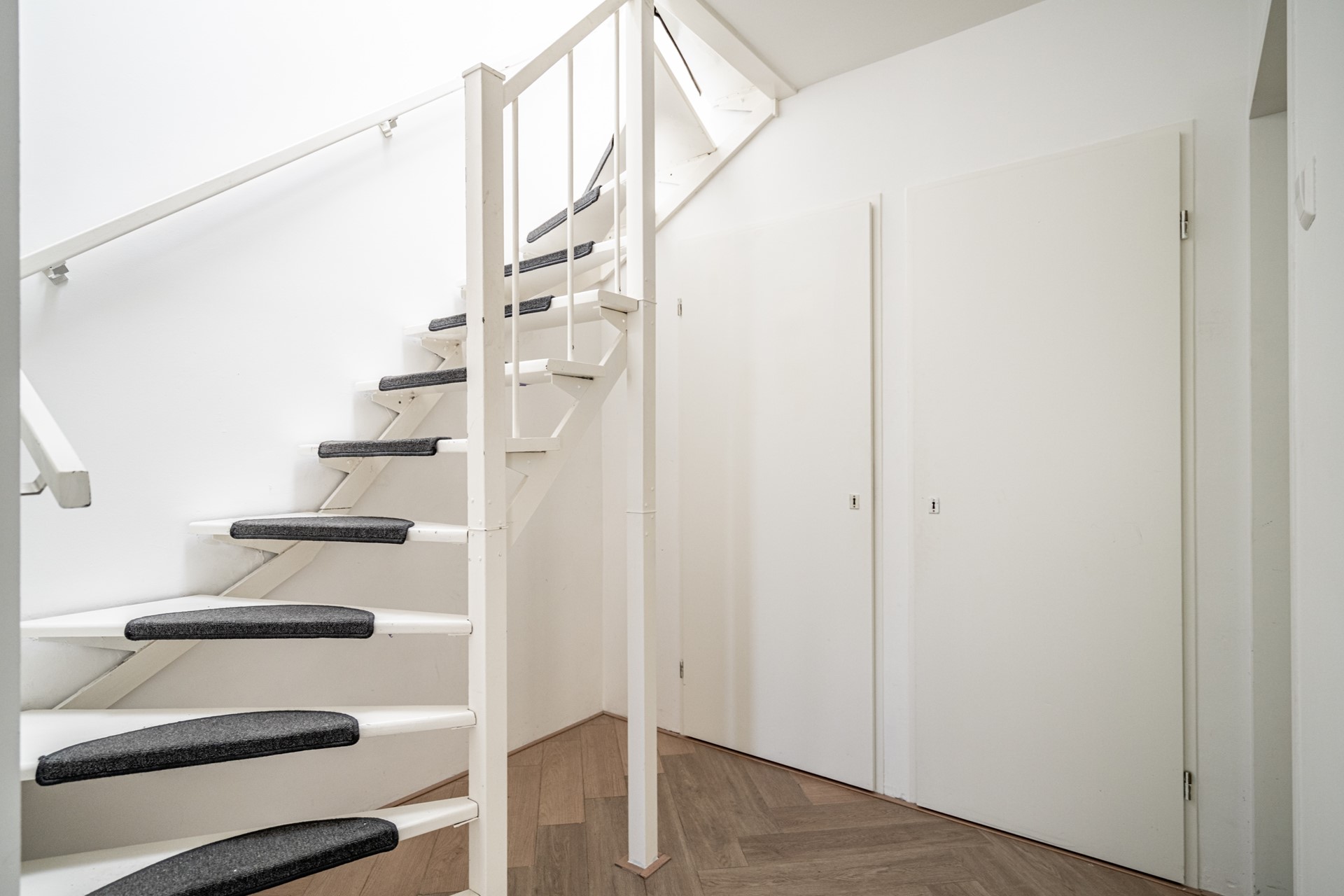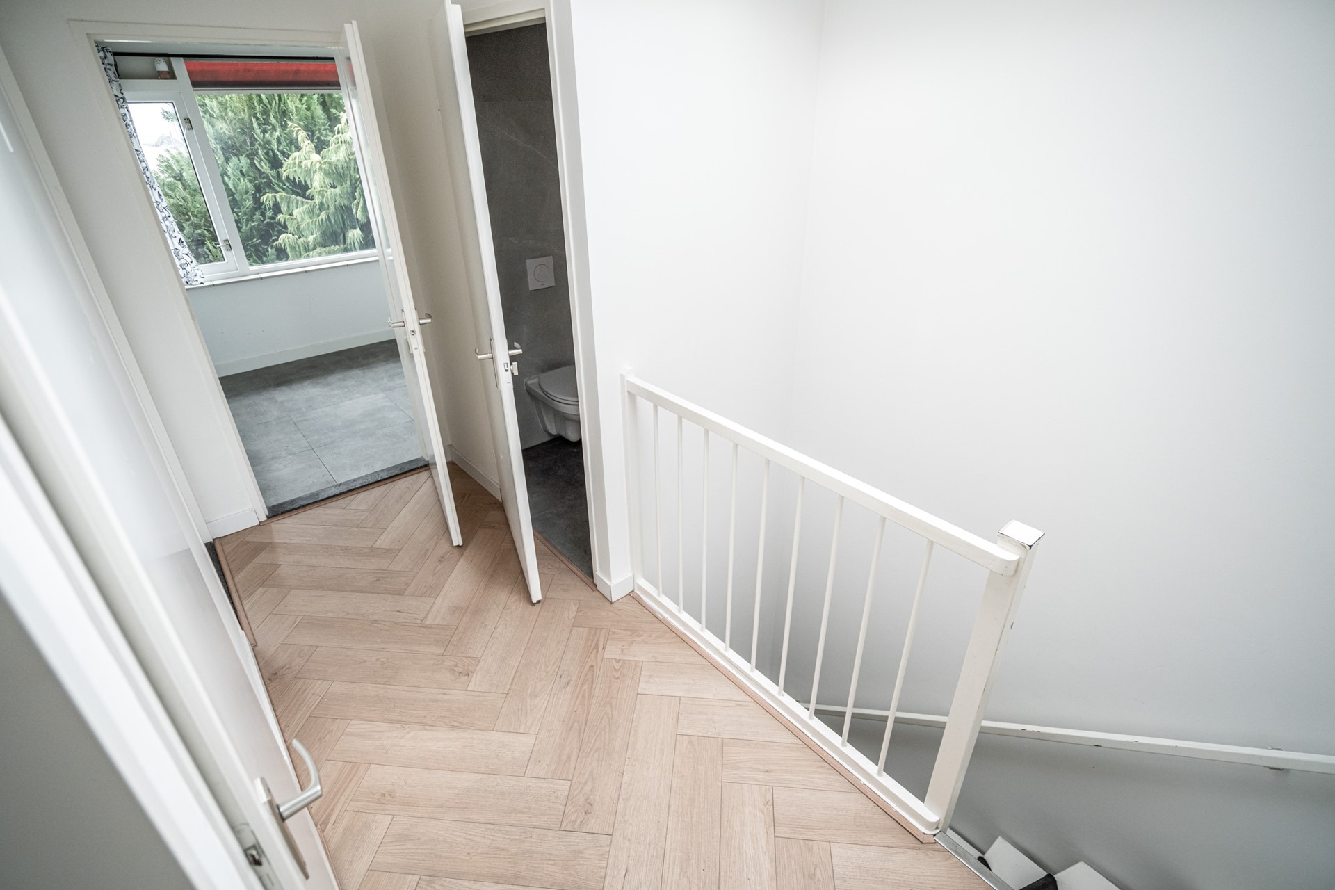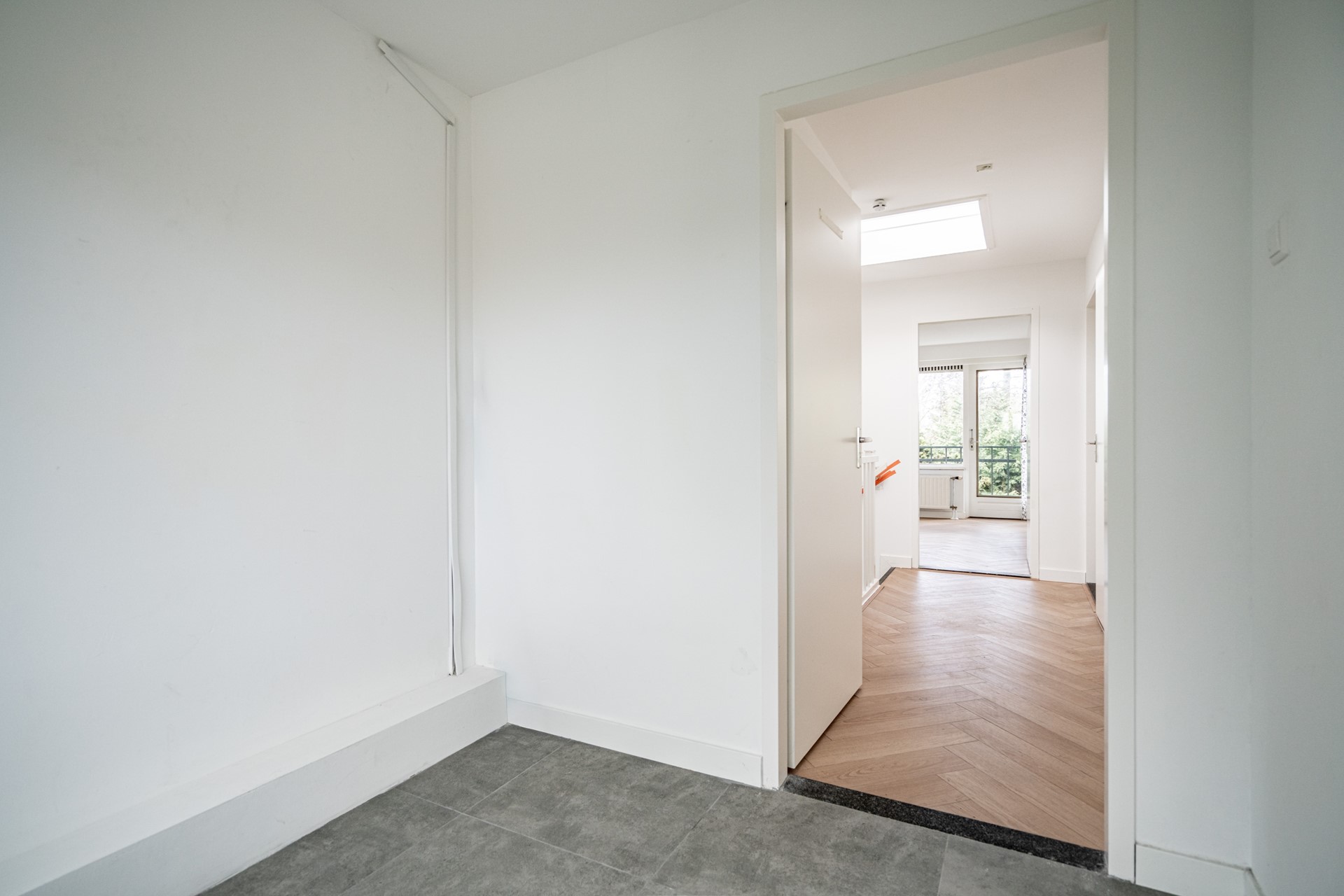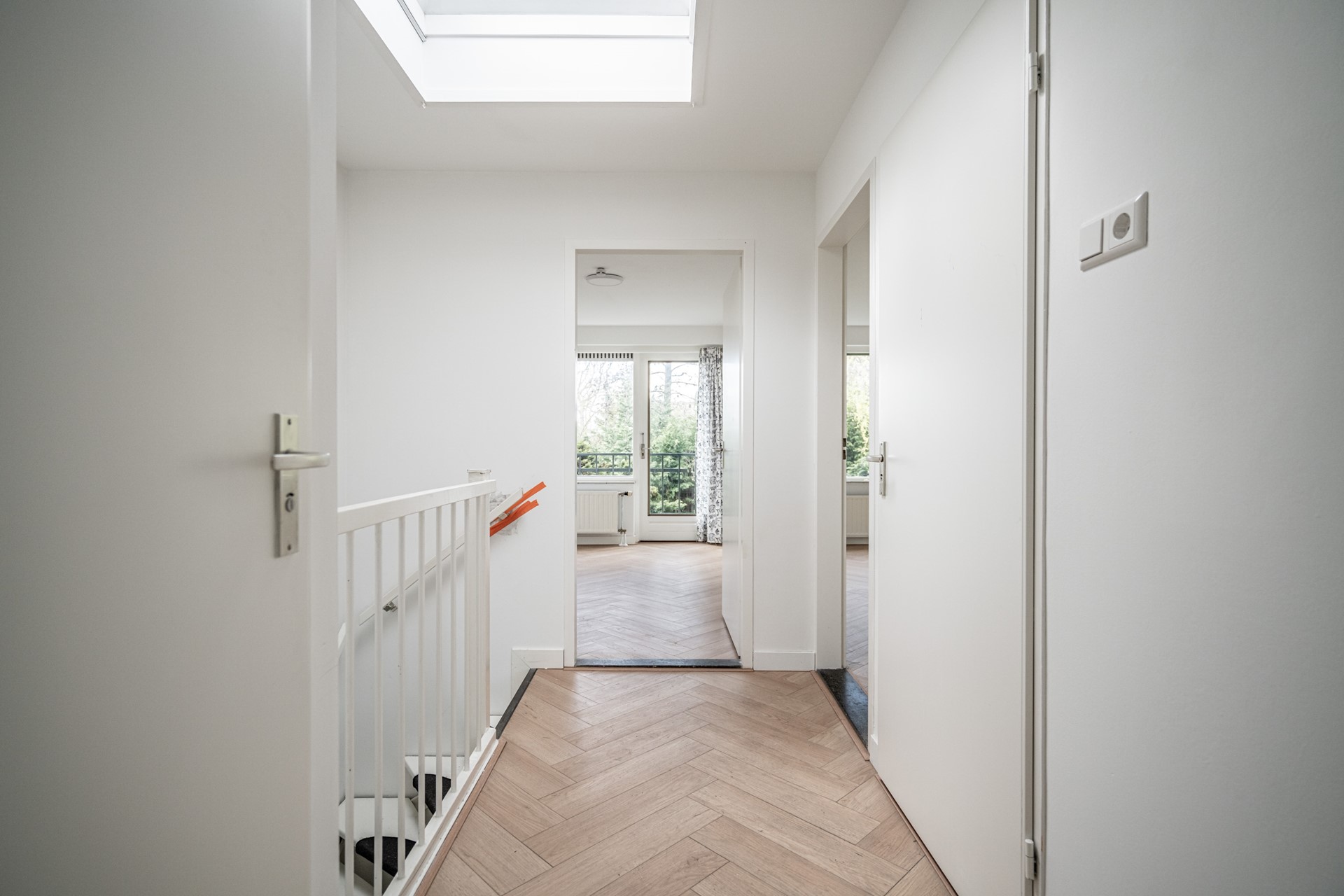 Landing with plenty of natural light thanks to a skylight, second toilet, and built-in cupboard. Spacious bathroom equipped with bathtub/shower and washbasin. Master bedroom at the rear with built-in cupboard. Rear-side room with access to the balcony. Additionally, a spacious bedroom at the front and an extra (bedroom/office).