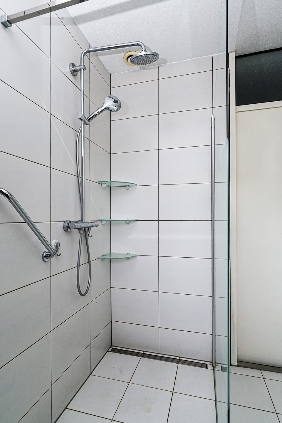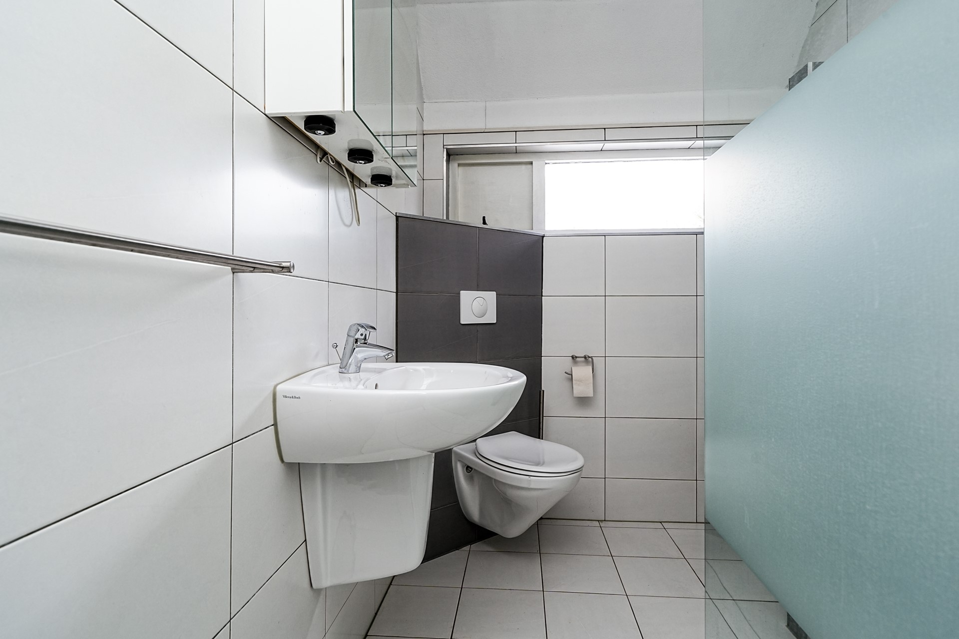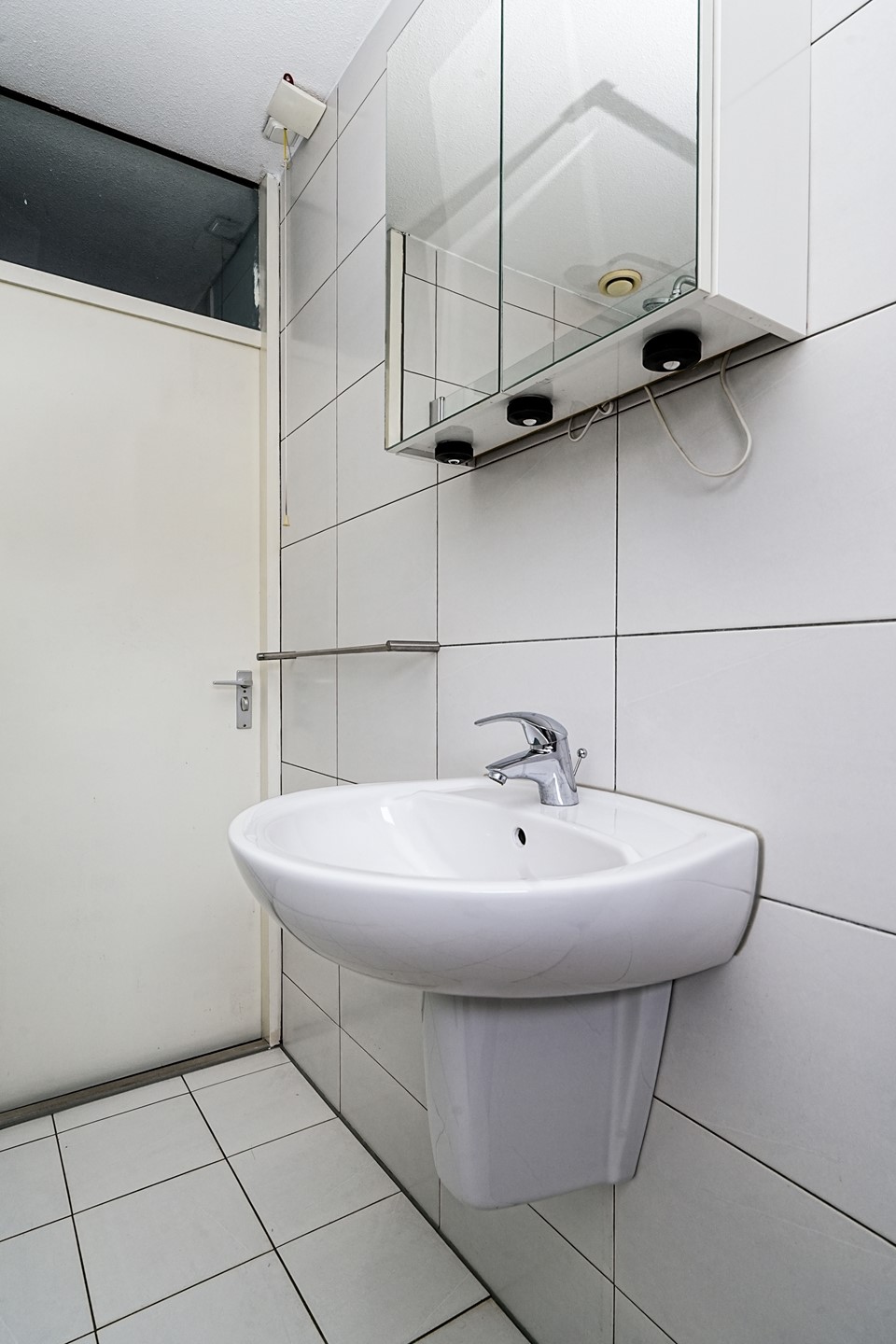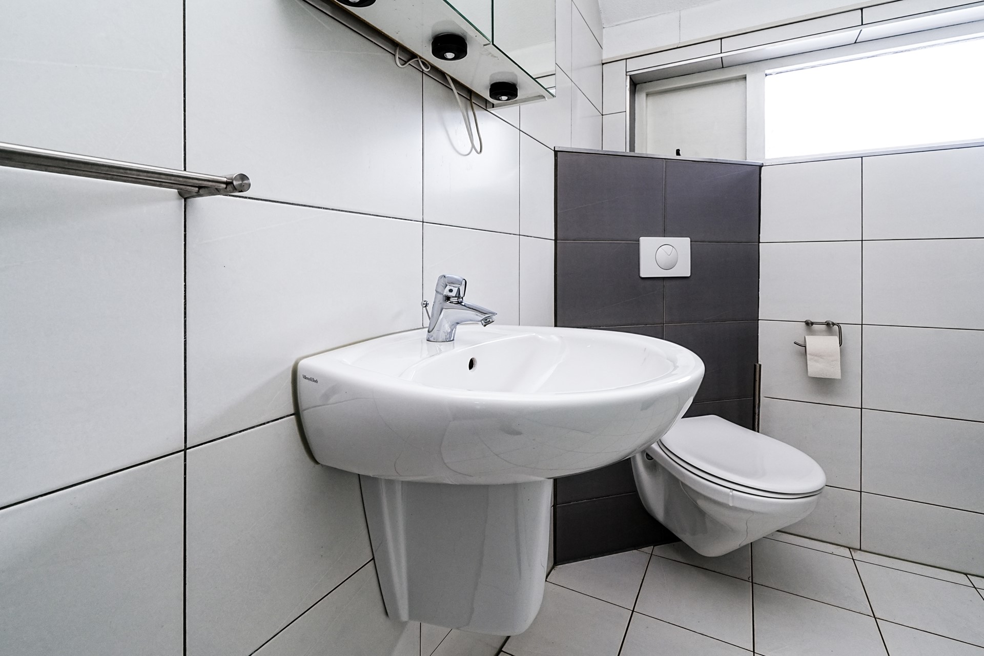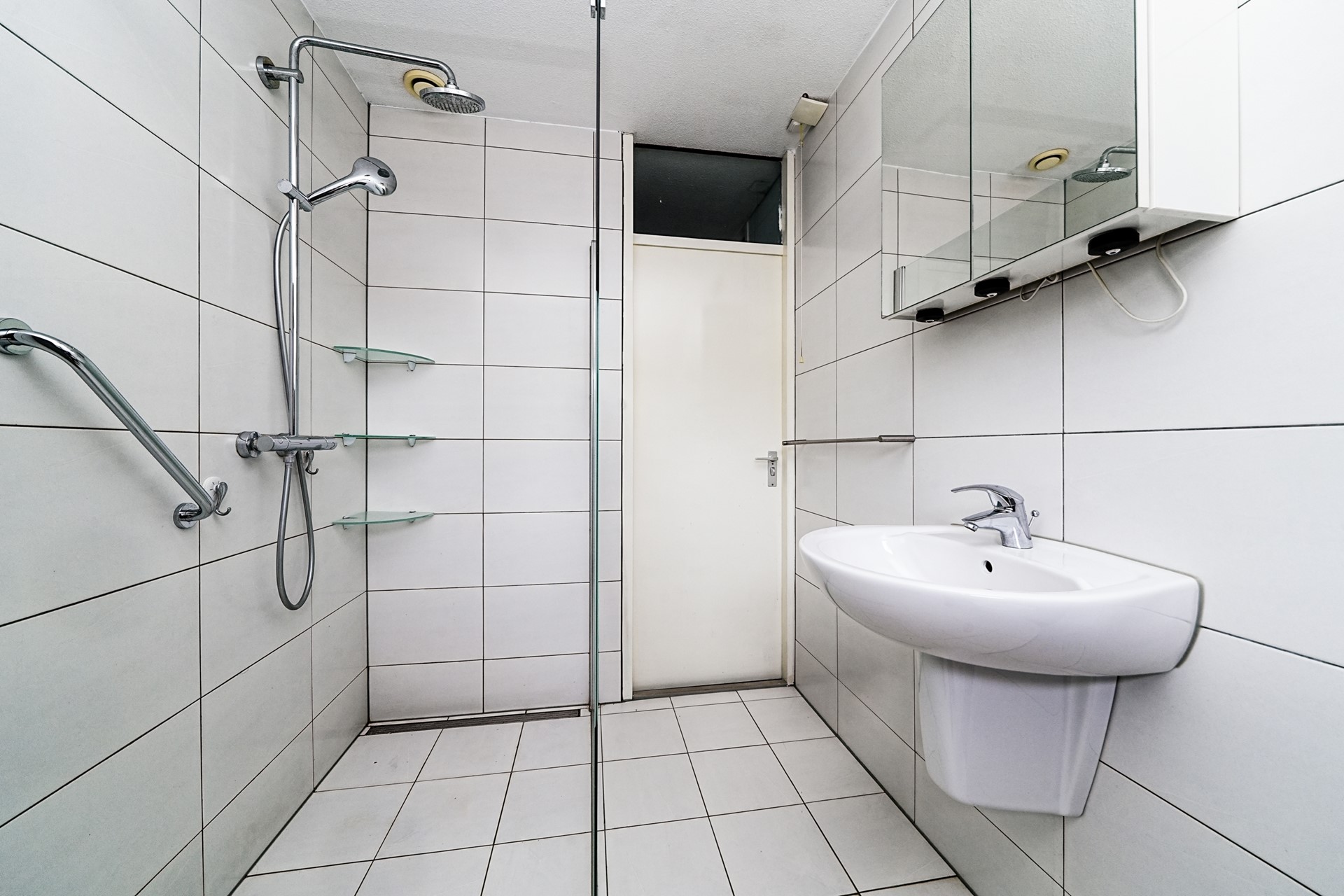 Aan de voorzijde zich de badkamer. De badkamer is functioneel ingericht en voorzien van een douche, wastafel en toilet. Daglicht en ventilatie worden verzorgd via het raam.