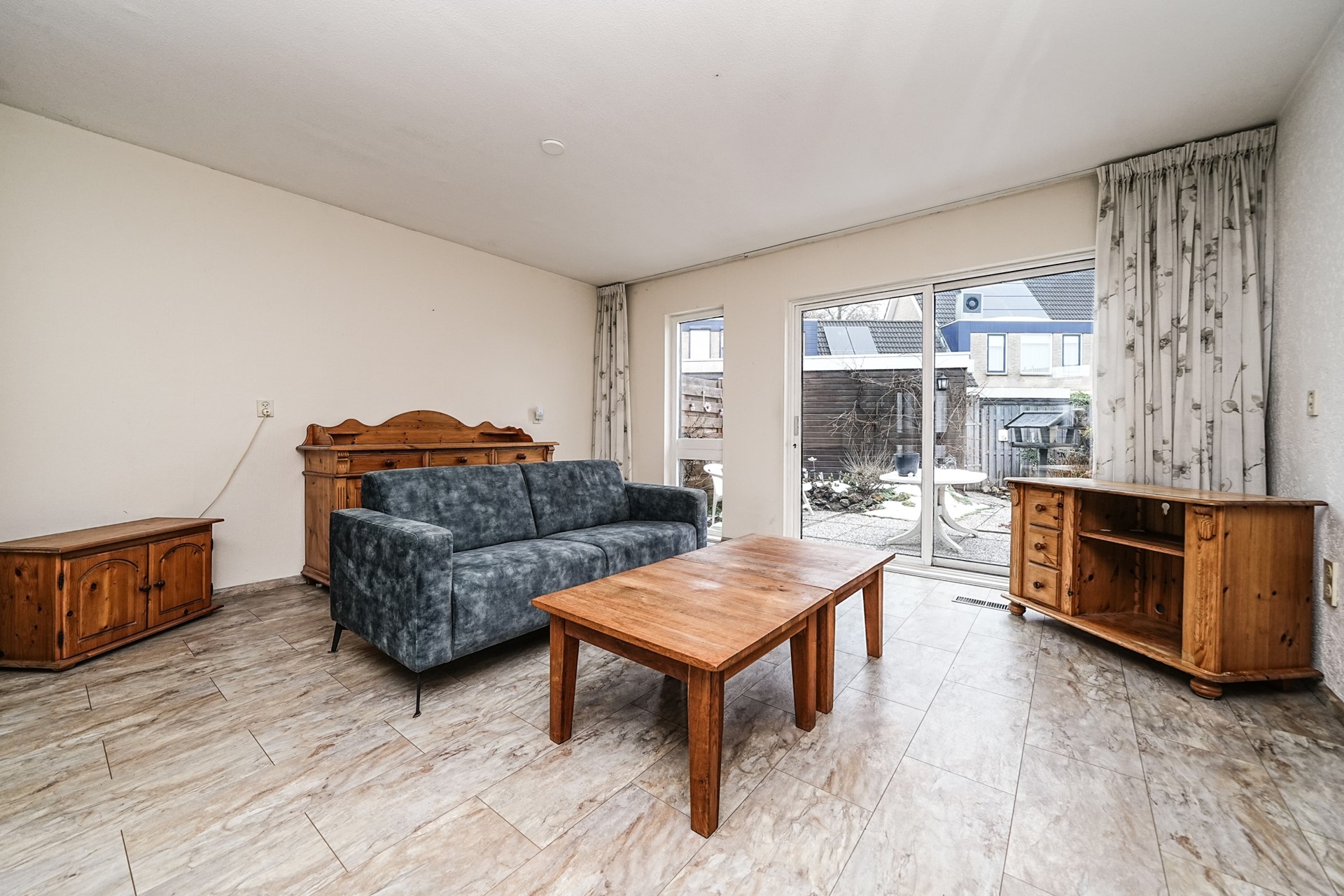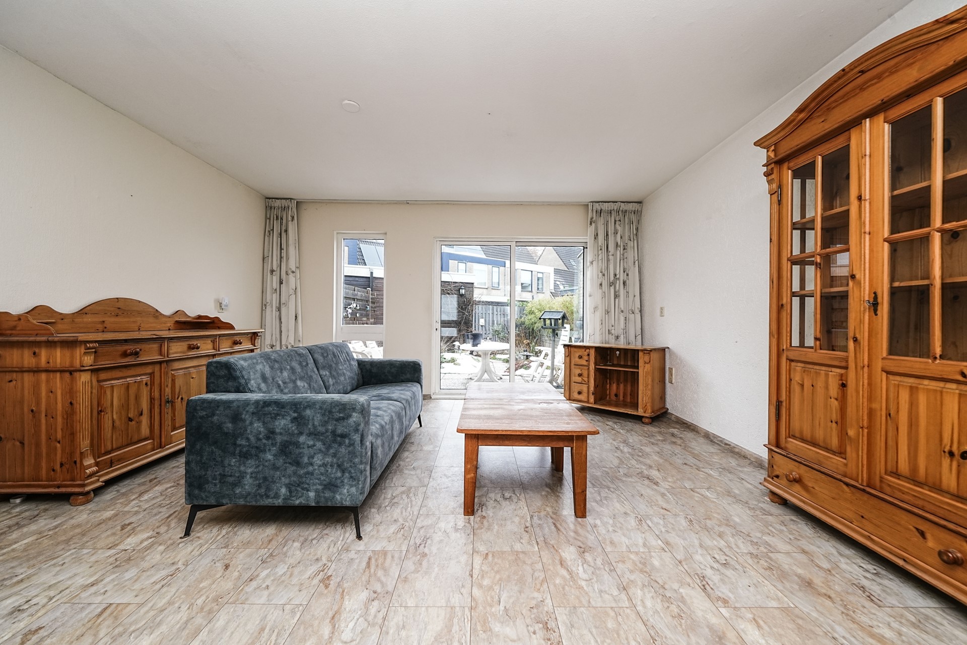 De ruime woonkamer, aan de achterzijde die zich over de volledige breedte van de woning aan de tuinzijde bevindt, is een lichte en comfortabele leefruimte. De grote raampartij en schuifpui aan de achterzijde zorgen voor veel natuurlijk licht en een directe verbinding met de tuin. Hier is voldoende ruimte voor zowel een gezellige zithoek als een royale eethoek.