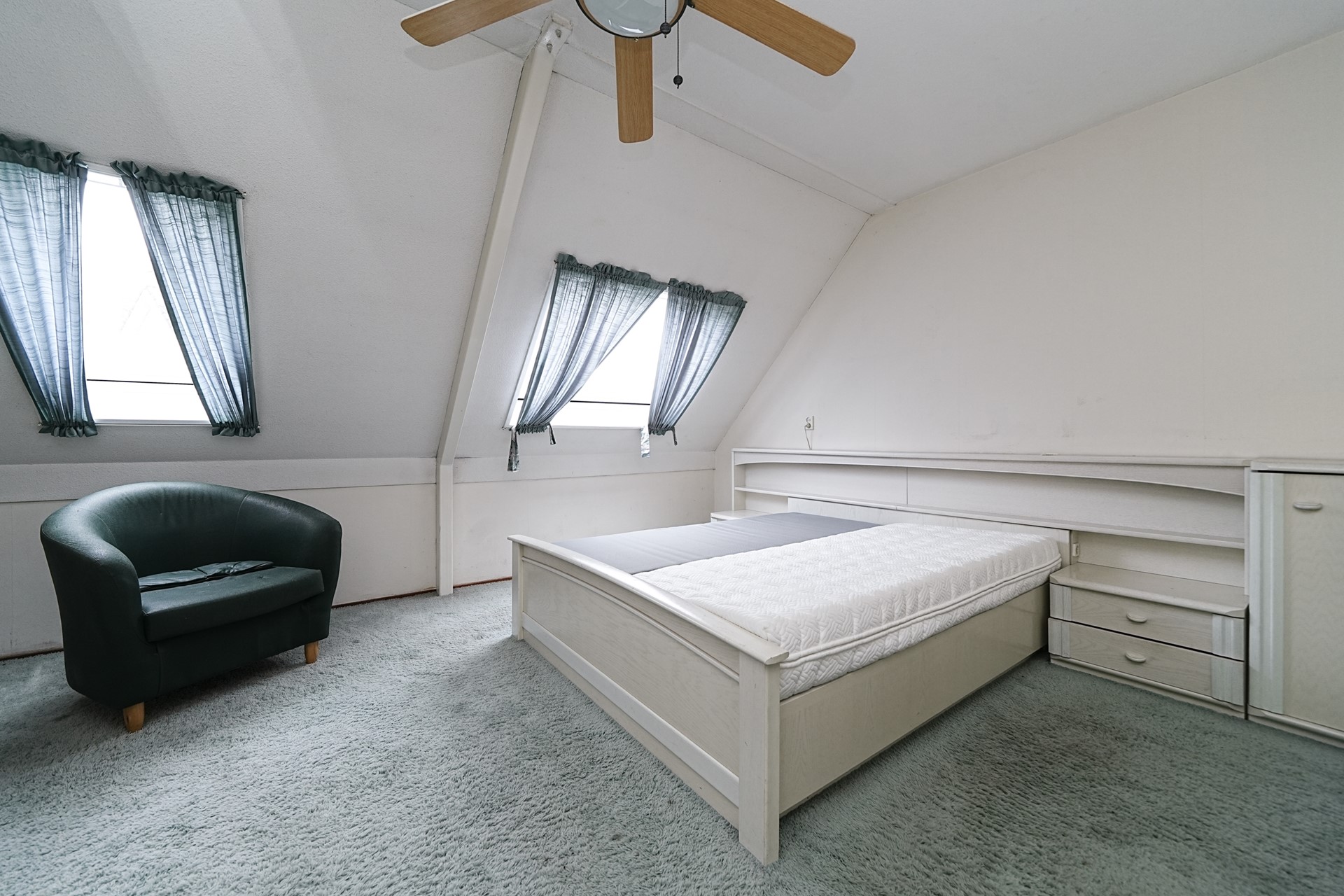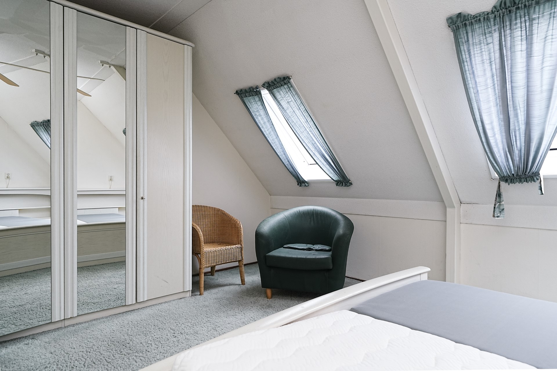 Aan de achterzijde van de woning bevindt zich een ruime slaapkamer (voormalig 2 slaapkamers). Deze kamer is aangenaam licht dankzij de dakramen en biedt volop ruimte voor een tweepersoonsbed en kastenwand.